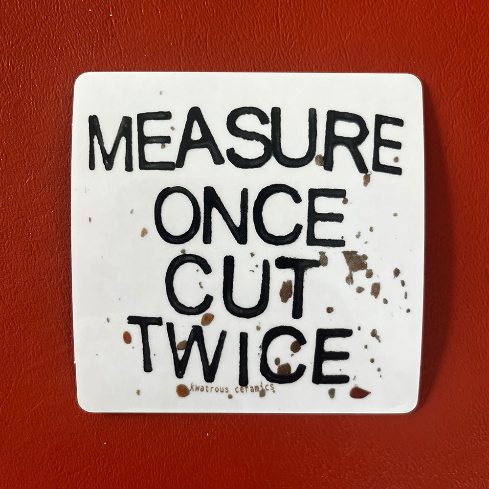 3×3 inch transparent sticker with black text. It says “Measure once, cut twice.”  Use the code “rabies” for free envelope shipping within the United States (does not include tracking).